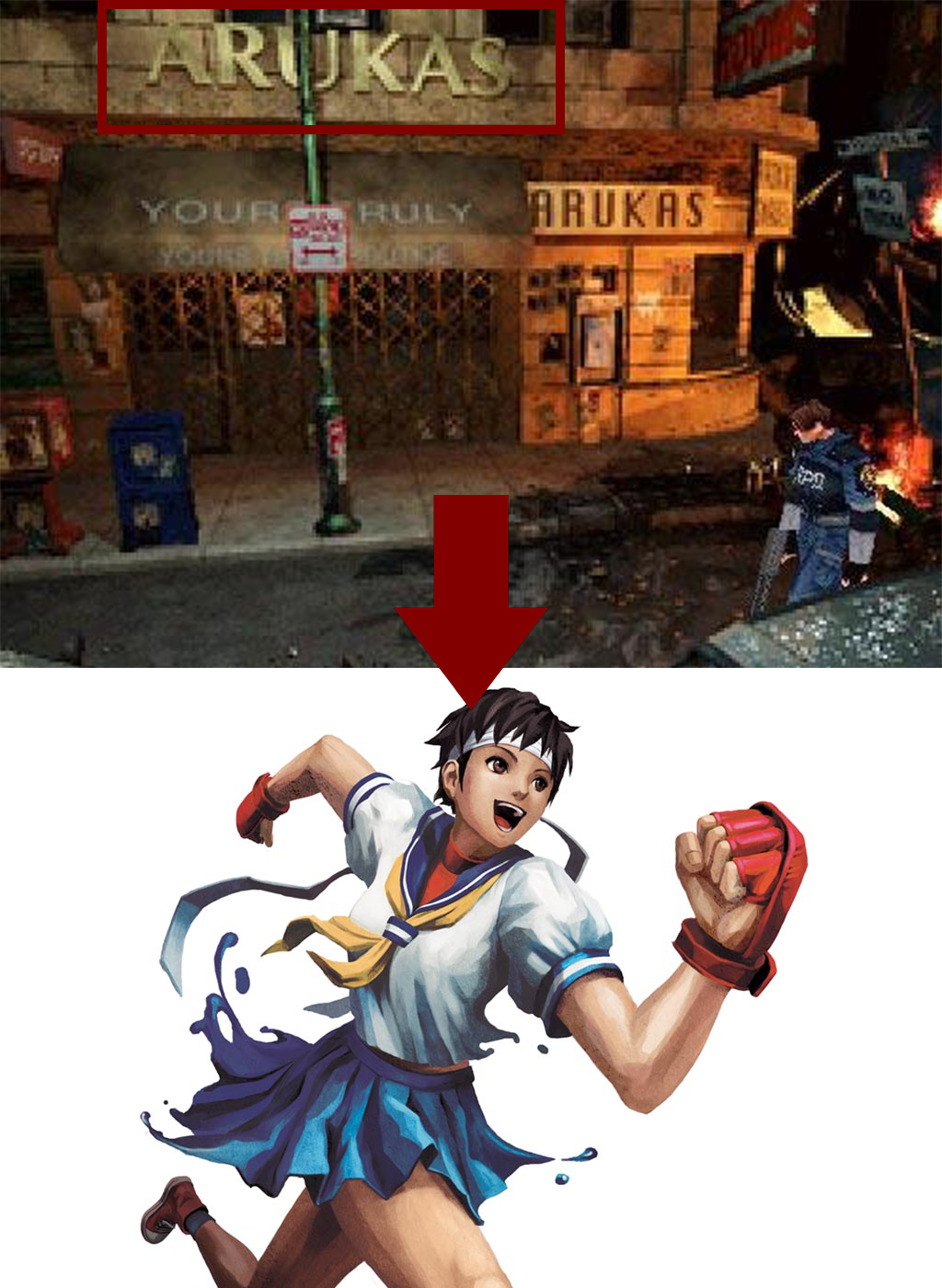 Arukas was a tailor shop in Raccoon City. Some time during the infamousRaccoon City Destruction Incident, Ben Bertolucci photographed the corpse of azombie outside of this shop.Spelled backwards, it reads Sakura, a reference to "Sakura Kasugano", a character in Capcom's Street Fighter series.
